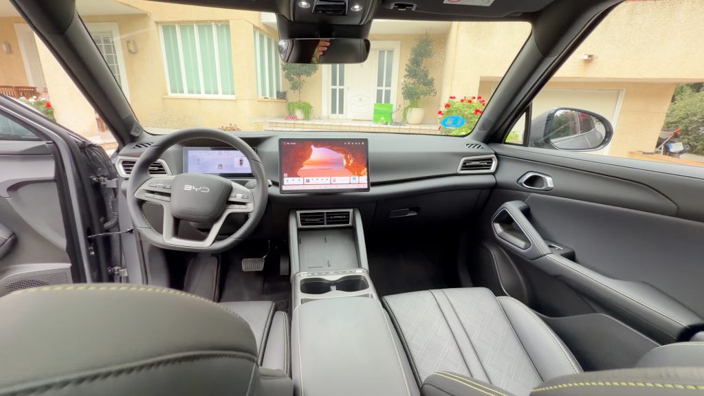 En general, el interior mantiene la línea BYD: mucho recubrimiento en piel sintética, plásticos blanditos donde toca, y la sensación de que no han venido a recortar por recortar.